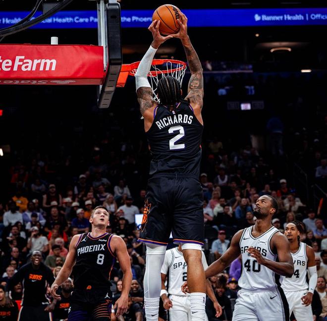第二节开打文班亚马还在场上,布克则场下休息,文班亚马内线护框成功,凯尔登篮下也被防成,理查兹利用节奏打了文班亚马一球,凯尔登还是强打篮下这次有了,理查兹篮下再次面对文班亚马造成犯规两罚全中35-26,不得不说他替补上来打得真不错。伊戈达罗进攻犯规球权给到马刺,文班亚马拿球就面对双人夹击,麦克劳林接球三分还是不中,太阳前场开球吉莱斯皮漂移长两分命中,卡斯尔不看人助攻凯尔登上篮命中,太阳始终无法缩小分差。阿伦传球失误哈珀持球推进,一个背运轻松过掉理查兹上篮打成2+1分差回到6分,这真的不像一名新秀球员。理查兹中距离命中,哈珀传球被断布克接球三分命中分差来到两位数,打到现在文班亚马一分没得!布莱恩特上篮不中,尚帕尼前场篮板传球失误,布克反击给到阿伦助攻理查兹暴扣太阳扩大领先到13分,马刺不得不暂停!