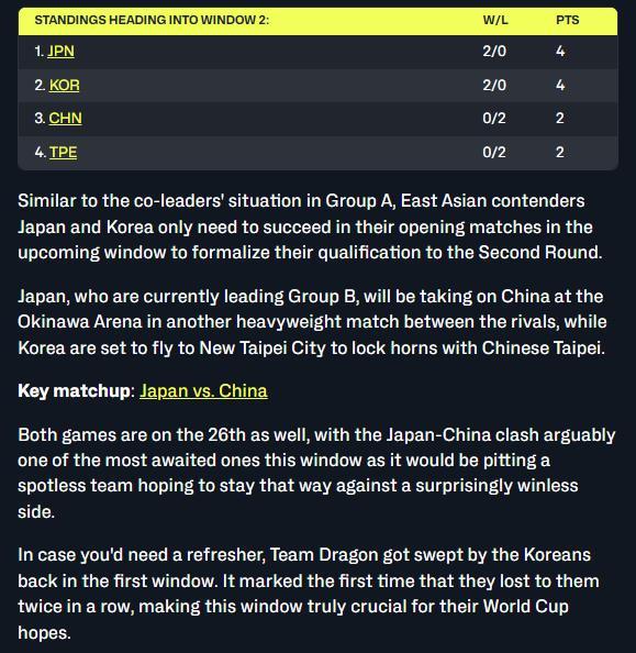 与 A 组中两位联席领队的境况相似,东亚劲旅日本和韩国只需在即将到来的窗口期内的首场比赛中获胜,即可正式获得晋级第二轮的资格。